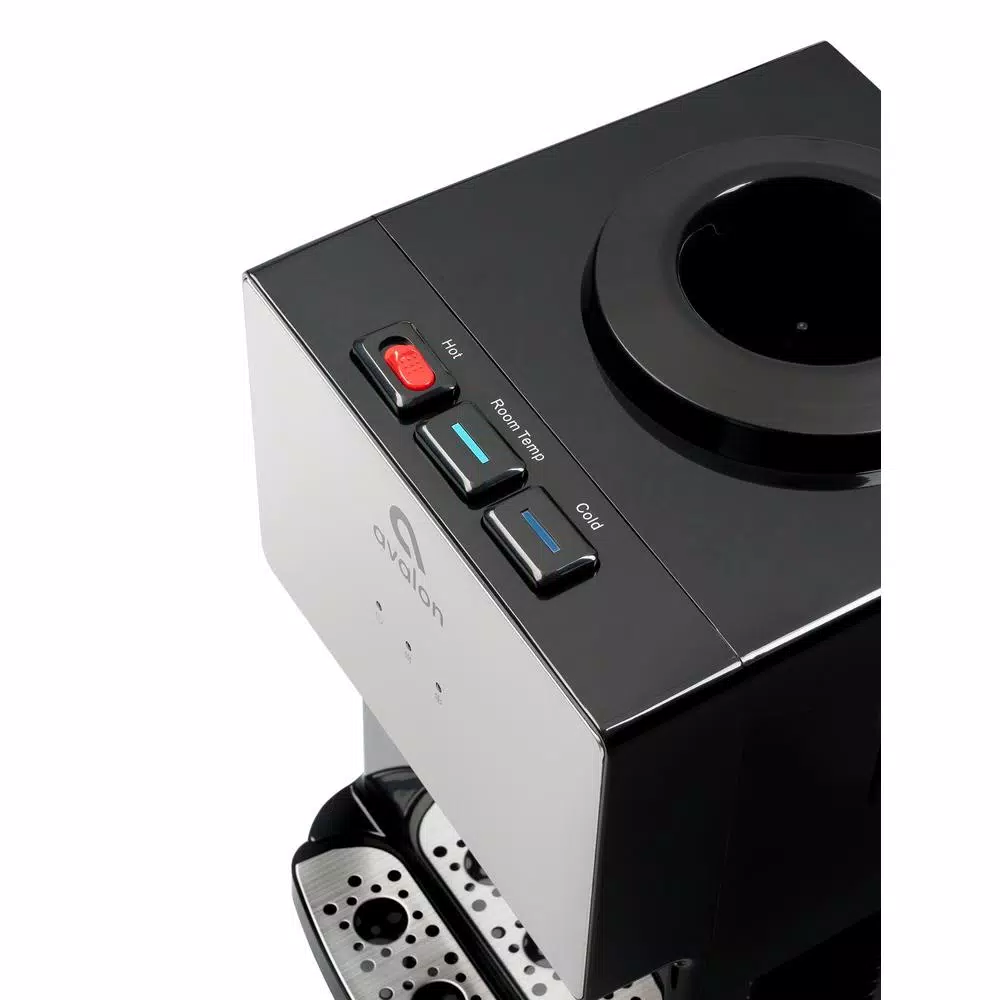 Avalon 3 Temperature Top Loading Water Cooler with Child Safety Lock is made with an innovative stainless steel body. It offers a choice of 3 water temperatures. The easy-to-use push button spouts make it so much more convenient to use. Simply press the temperature button of choice and allow the water to flow from the given spout. The machines highly efficient compressor makes the cold water crisp and ice cold at approximately 47F without the need of adding ice cubes to your drink. The hot faucet is hot enough to cook one’s tea or coffee or any other steaming hot beverage at approximately 180F. Due to the extremely hot water, we’ve added a child safety lock on the hot water faucet. The dispensing area is 12x3x10 in. with 9 in. of space below the spouts. The water cooler is UL listed and complies with all standards of ENERGY STAR. The unit dimensions are 12 in. x 13 in. x 41 in.