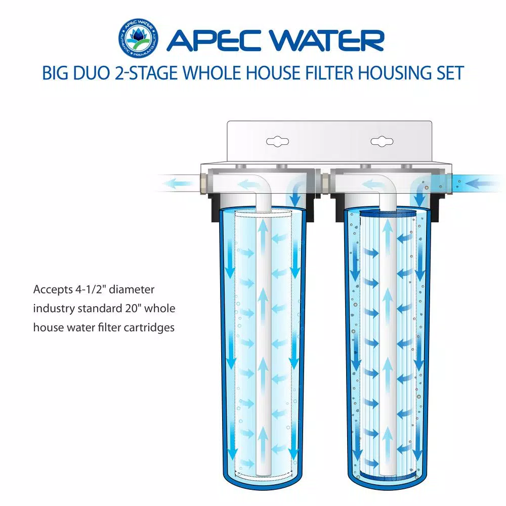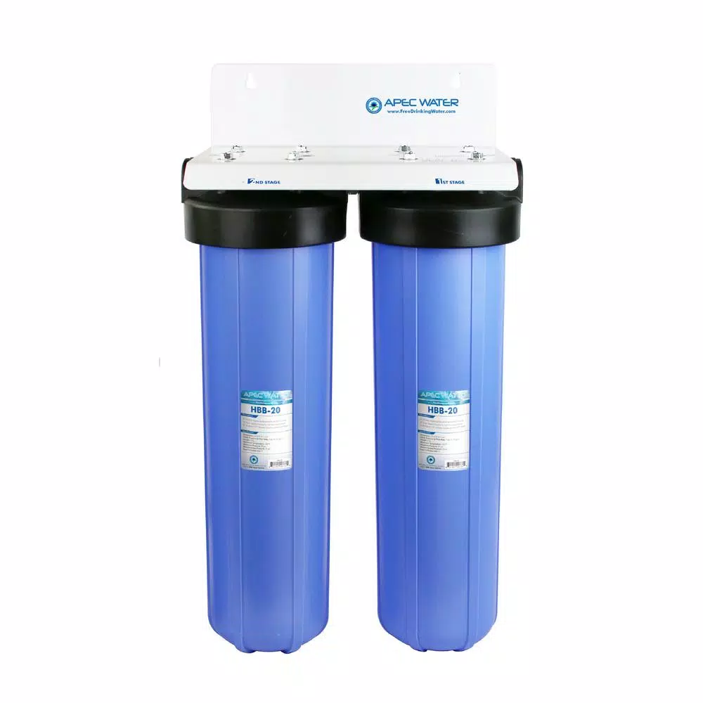 The APEC Big Blue 2-stage whole house filter housing set FH-2BB-20 offers multi-stage whole house water filtration versatility and efficiency. Dual housings allow this unit to utilize two distinct specialty filters to address a wider range of contaminants found in different water sources. This is often not possible when using just a single whole house filter.This customizable housing set works with all industry standard 20″ whole house filters, making it one of the most adaptable and affordable multi-stage whole house filtration systems on the market.H-2BB-20 is extremely durable and can withstand a wide range of chemicals in the water as well as large fluctuations in water pressure. The polypropylene (HFPP) cap has 1″ FPT inlet and outlet ports for high-flow rate and the 1.25″ internal port allows a greater volume of liquid to pass through the HFPP cap more rapidly.