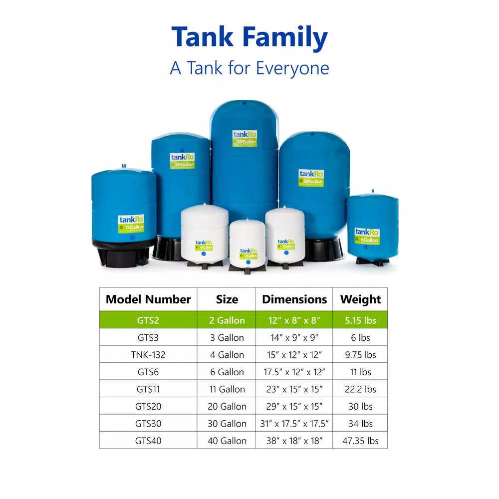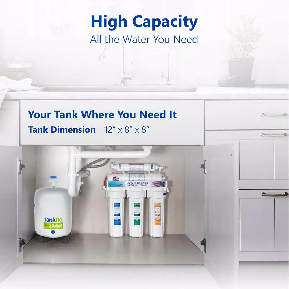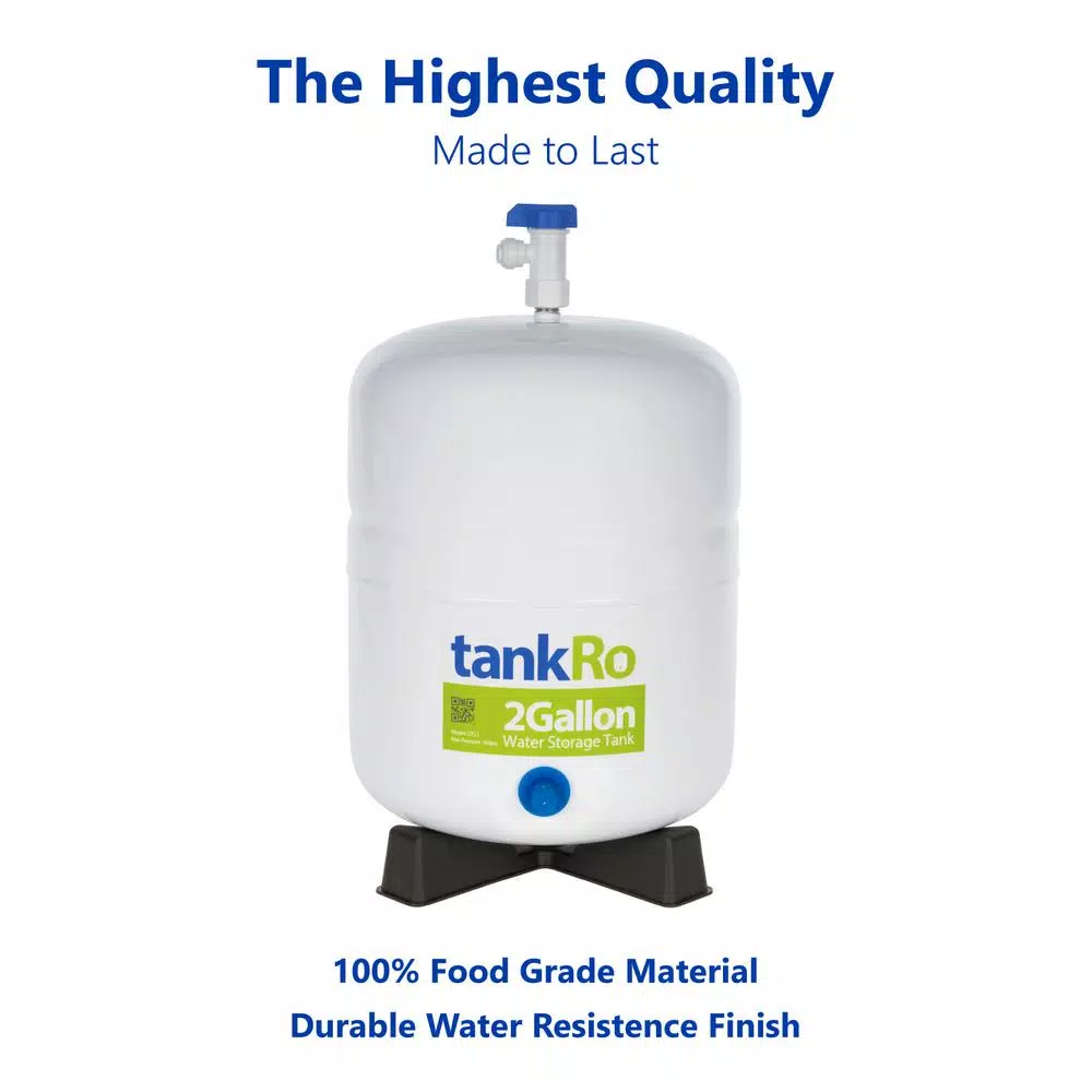 Heavy Duty Construction -All Materials in the expansion tank are 100% food safe and FDA grade to make sure your water is tasteless, odorless, and contaminant free -The inside of the RO water tank is completely smooth to prevent damage to the bladder -The water storage tank is coated with a two-part epoxy primer and finished with polyurethane to resist damage even in the outdoors -The adjustable bladder within the water tank is made of high grade Chlorobutyl rubber and is completely airtight -The inside liner of the water filter tank is made of Virgin Polypropylene, the most durable liner even on a molecular level All the Water You Need A 2-gallon water pressure tank can hold 1.5 gallons of water. All tanks have a certain amount of their capacity used by the air bladder, which is necessary for drawing water from the water reservoir tank. Be Confident All components are high quality food-grade -Each RO tank passes extensive durability testing -A sealed brass air nozzle and o-ring sealed air valve caps means consistent air pressure -This reverse osmosis tank is designed to last over five years