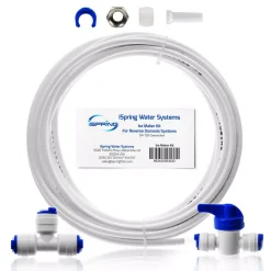 Imaging you can get clean drinking water and crystal clear odd-free ice cubes right from your refrigerator. This ISPRING ice maker kit connects refrigerator to your existing water filter such as a reverse osmosis system. It will replace the small, ineffective and expensive refrigerator filters. This kit includes everything you will need to quickly and easily connect your refrigerator and water filter system. It comes with 20 ft. of polyethylene tubing, a quick-connect splitter, a quick shut off valve, and an inline quick fitting. For better compatibility and your convenience, it also includes a brass compression fitting kit that can be easily screwed on refrigerator’s water inlet, where the refrigerator feed water line mounts. It fits any water filter systems that use 1/4 in. tubing (contact us for adapter if it is in different size such as 3/8 in.).