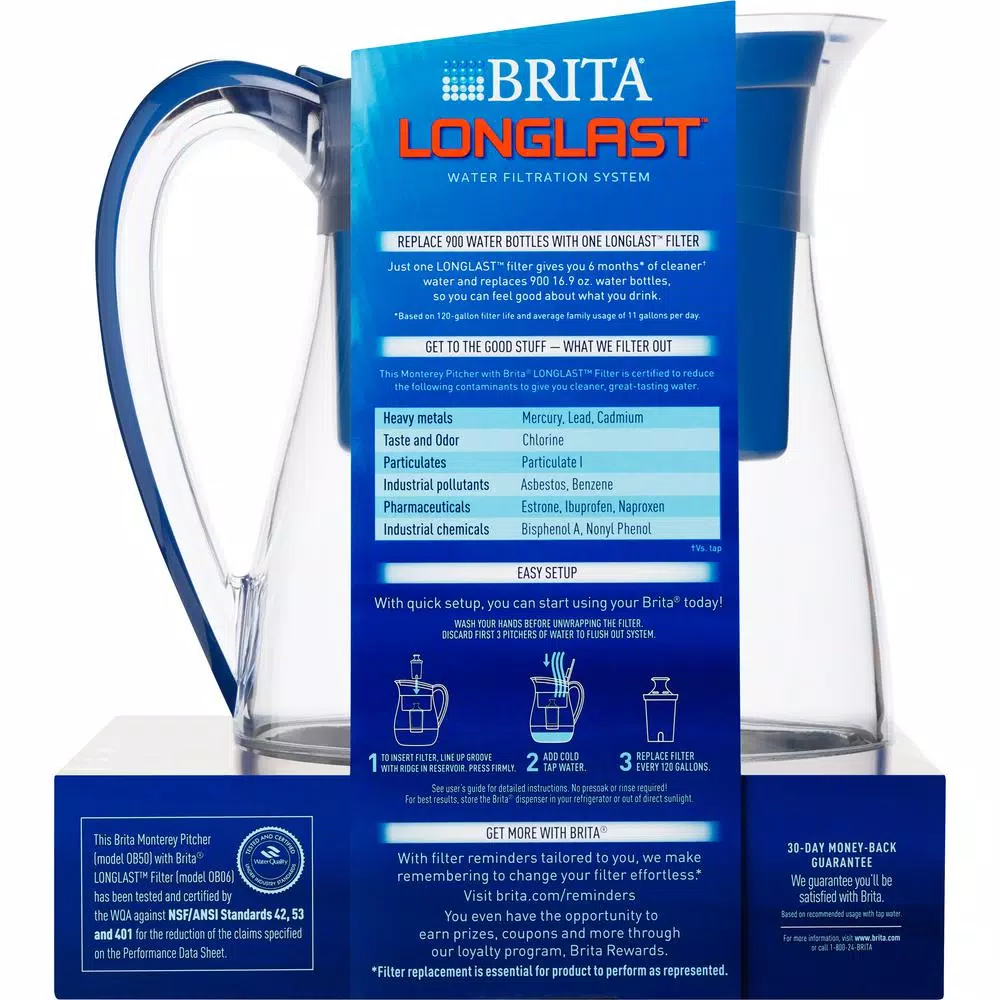 Brita filters out impurities and odors so that you can drink healthier, great tasting tap water with this BPA free plastic water pitcher. This Monterey Pitcher includes a Long last Filter that works 3x longer, so that you can enjoy fresh filtered water for up to six months between filter replacements. Plus, it reduces more contaminants than a Standard Brita Filter and is certified to reduce particulate class 1, cadmium, mercury, lead, asbestos, and benzene found in some tap water. This 10 cup capacity large Brita pitcher has a modern rounded shape for easy cleaning, a smooth wide handle and an easy fill lid making it easy to grip, fill and pour. The electronic filter change indicator reminds you when to swap out the filter. Live the filtered life with Brita and enjoy a year of crisp and clean tasting water. Brita delivers delicious, better tasting and better for you filtered water with every sip.
