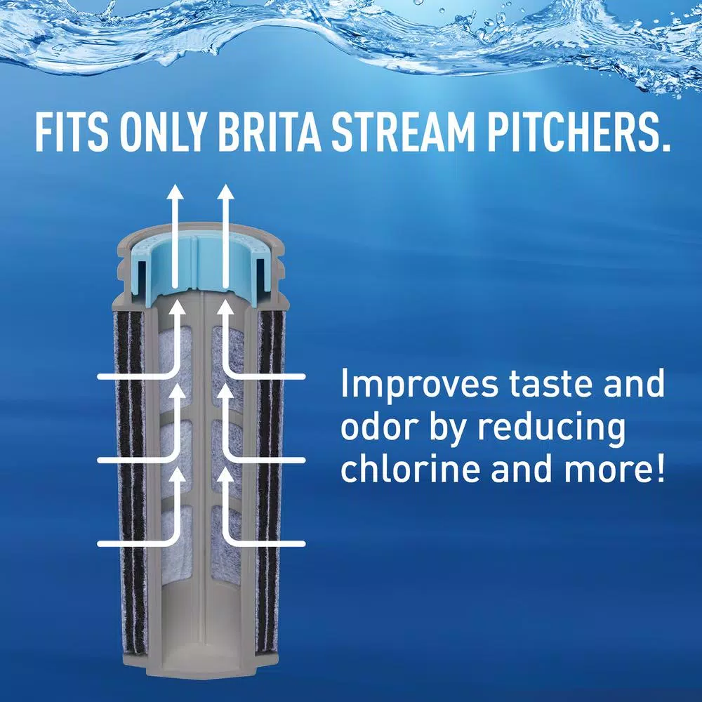 BPA-free Brita Stream Replacement Filters are made with Filter-As-You-Pour technology so you can get filtered water 10X faster compared to the market leading pitcher system. Made with proprietary dual-layer filtration technology and containing activated carbon to reduce chlorine taste and odor., These filters deliver great-tasting water and maintain a healthy level of fluoride, an additive in water that promotes strong teeth (applies to fluoridated municipal tap water). The filters have an easy-hold grip and click button for simple insertion and removal. Change these filters every 40 gallons, about 2 months for the average family, for best performance. The innovative carbon form means no black flecks. One Stream filter can replace 300 standard 16.9 ounce water bottles. Drink cleaner, great-tasting water with Brita.