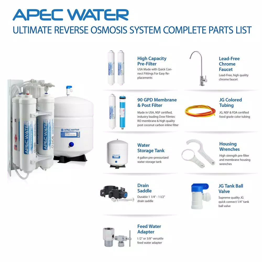 The light and compact RO-QUICK90 reverse osmosis water filtration system is designed with simplicity and performance in mind. Put through the same rigorous quality control process as other APEC reverse osmosis systems, it offers the same high purity RO water. Rated at 90 GPD, it delivers unlimited safe, clean, great tasting water right at home. The featured Quick-Connect fittings make filter change-outs intuitive and easy. The all-in-one inline filter can be disposed as a single unit, eliminating break and leak, as well as reducing microorganism build up. The space-saving design is perfect for compact under sink cabinet with limited storage space. This APEC Ultimate RO-QUICK90 ensures the highest contaminant removal rates, providing you the purest water possible.