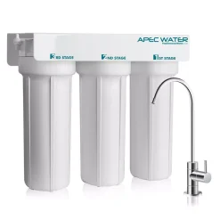 The APEC Water Systems WFS-1000 3-Stage Water Filtration System delivers clean filtered water at an affordable price. This complete 3-stage water filter system is made from high caliber components to offer long-lasting, reliable performance, while removing chemical, taste and odors. The 3 premium quality filters lasts over 12 months for fewer filter change outs and high performance. The system provides a continuous on demand supply of quality filtered water directly to the provided water dispenser.