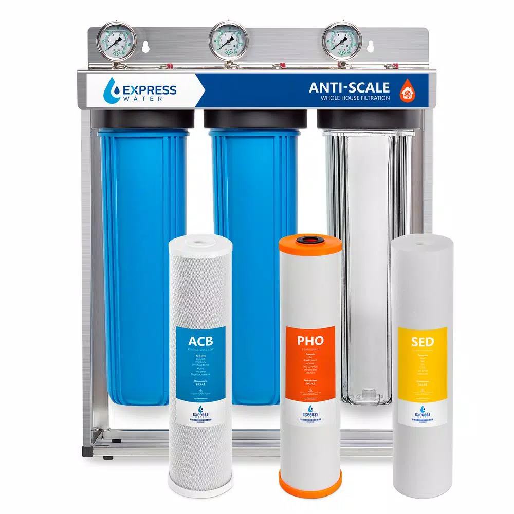 - Whole House Water Filter: Reduce harmful contaminants from your entire home’s water with Express Water’s 3 Stage Water Filtration System. Anti Scale Water Filter: Drink the healthiest water on Earth as your home water filter reduces over 65 different contaminants from your water including chlorine, rust, algae and more while protecting your home from the formation of scale and corrosion