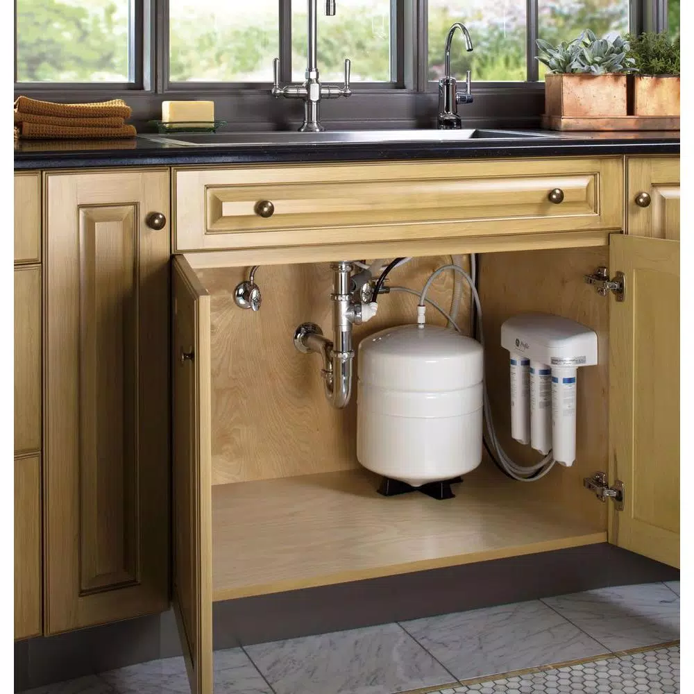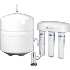 The Profile Reverse Osmosis Filtration system is a premium filtration process. It has an extra-large 8.46 Gal. capacity per day. The system includes a chrome faucet, pre-and-post filters (FQROPF), membrane (FQROMF), storage tank, filter reminder light and full installation kit included.