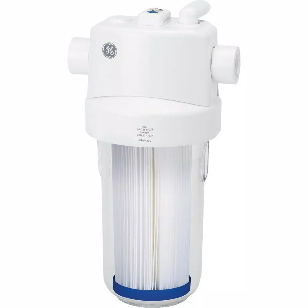 The GE Heavy-Duty Household Water Filtration System with filter included reduces sand, sediment and rust from your main water supply. It is a high-flow system with a 40 psi – 100 psi feed water-pressure tolerance. A clear sump allows easy viewing of the filter to monitor its condition and a canister wrench is included for easy filter changes. A bypass valve helps increase filter life when filtered water is not needed. This quick-connect system comes with hardware and an installation kit. It is NSF certified for safety and reliability.