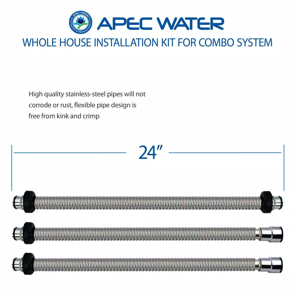 Connecting pipes for whole house system installation are often overlooked but crucial to your system performance and efficiency. Therefore, choosing the right parts for your equipment is essential. APEC Whole House Installation Kit with quick connect fittings helps revolutionize the DIY installation process. Whether you have copper, cPVC or PEX piping, connecting your system has never been easier. No cutting pipes, no gluing, no special tools required. Additional piping and fittings may be needed for special water pipes. Please check your local plumbing codes for proper installation.